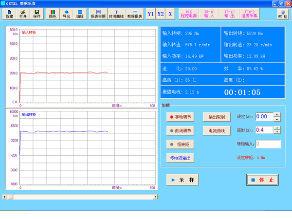 - 所有儀器通過RS485總線與電腦連接,實現對變速箱的自動加載以及對數據的集中采集。實時顯示各參數與時間之間的關系曲線,以記錄整過測試過程。