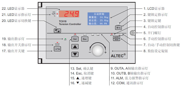 當控制器工作在自動控制模式時,自動控制指示燈(AUTO)點亮,可旋轉(zhuǎn)數(shù)值設定旋鈕或按遞增鍵/遞減鍵修改張力設定值,按AUTO/MAN鍵可切換到手動控制模式。