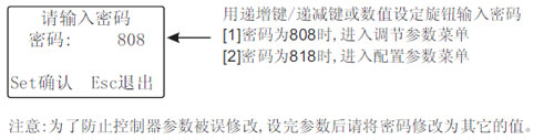 當控制器處于“自動控制”或“手動控制”顯示界面時,此鍵用于鎖定(防止誤操作)或解鎖,鍵鎖定后將使遞增鍵 、遞減鍵、Set/Esc鍵、自動/手動切換鍵、輸出開關(guān)鍵和數(shù)值設定旋鈕失效。