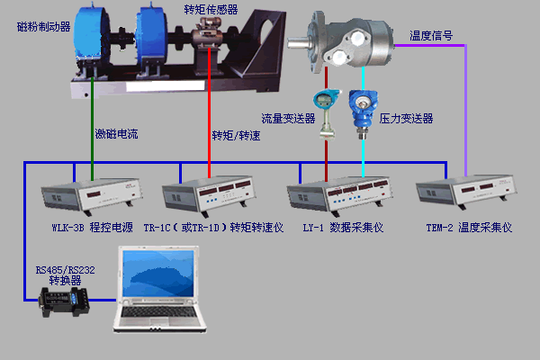 - 系統(tǒng)通過1臺相位差式轉(zhuǎn)矩轉(zhuǎn)速傳感器及1臺TR-1C轉(zhuǎn)矩轉(zhuǎn)速采集儀(或TR-1D轉(zhuǎn)矩轉(zhuǎn)速采集儀)采集馬達(dá)的輸出轉(zhuǎn)矩和轉(zhuǎn)速;用1臺LY-1型數(shù)據(jù)采集儀采集流量和壓力;用1臺TEM-2溫度采集儀檢測溫升;用WLK-3B程控電源控制磁粉制動器對馬達(dá)進(jìn)行加載。